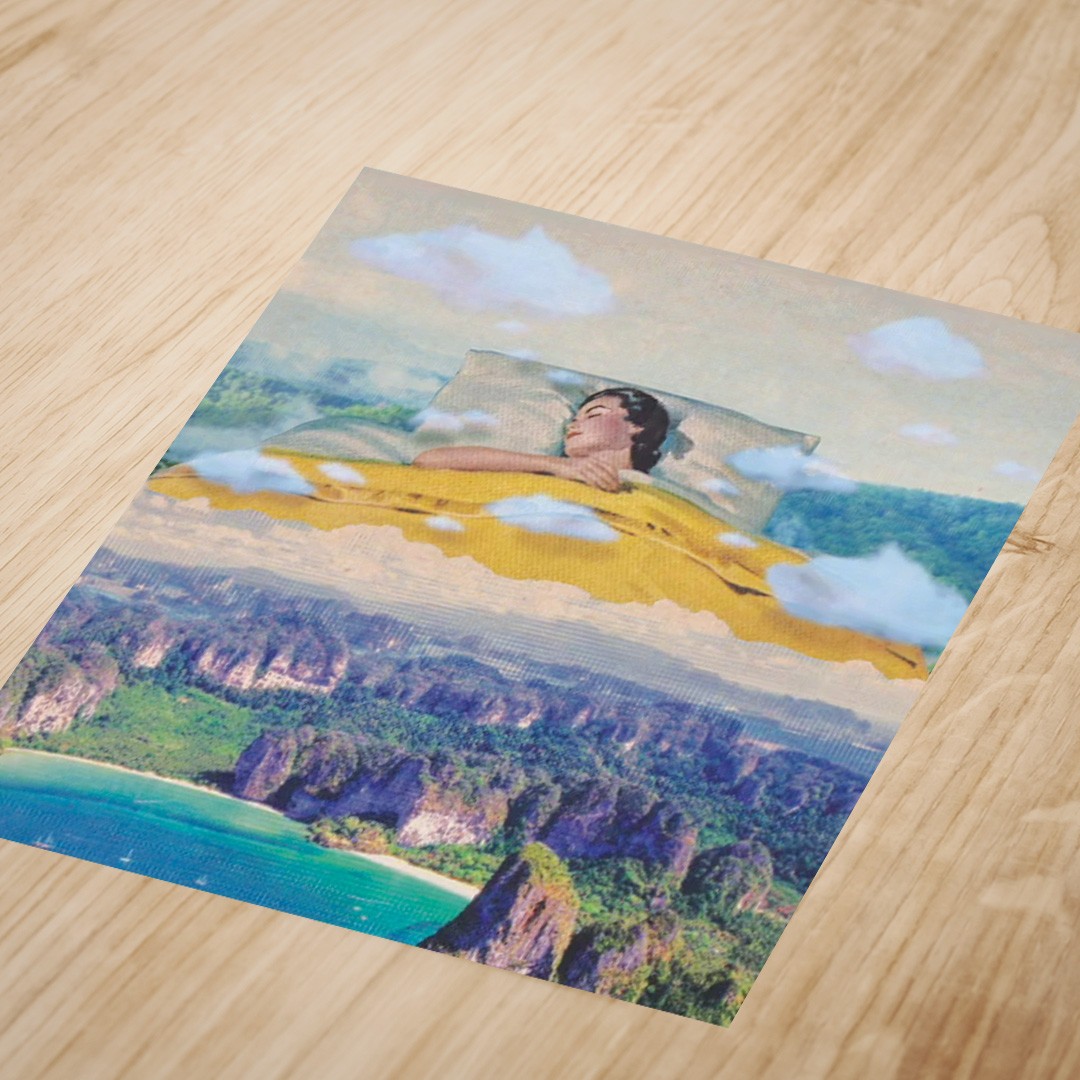 12″ x 12″ print of the digital collage artwork “Sleepin On A Cloud”.